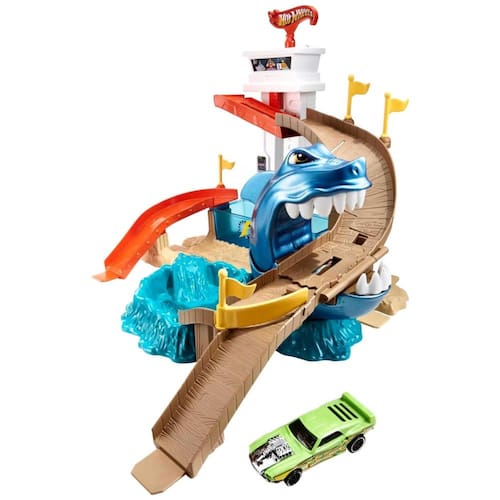 Experimente a emoção e a ação neste passeio com mudança de cor enquanto tenta escapar do tubarão gigante Carchomping. Desça a rampa da torre em alta velocidade, mas tenha cuidado para não ser pego pelo tubarão faminto por metal. Se isso acontecer, use outro veículo para acionar a alavanca de liberação e lançar o carro capturado em segurança. O conjunto Sharkport Showdown inclui um carro Color Shifters e duas zonas de mudança de cor, além de um tanque de imersão e uma piscina infantil. Este conjunto também pode ser conectado a outras pistas Hot Wheels para expandir o mundo das corridas masculinas. Adequado para crianças a partir de 4 anos.