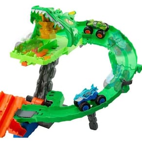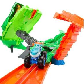 Este conjunto da Mattel inclui a pista de destruição do dragão e dois Monster Trucks em escala 1:64: Great Bite e Rageasaur.