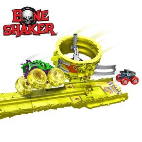 Um Skelesaurus de grandes dimensões e o Bone Shaker em escala 1:64 se enfrentam em uma corrida para evitar a destruição! Você pode soltar os dois veículos com o interruptor de energia e ver se o Bone Shaker consegue vencer o inimigo maligno enquanto eles descem uma colina em alta velocidade em direção a um enorme loop A distribuição aleatória seleciona um de dois resultados: O Bone Shaker consegue atravessar o loop e escapar em segurança, enquanto o Skelesaurus fica na poeira, ou o Skelesaurus pega sua presa, prendendo o Bone Shaker no loop, derrubando-o O conjunto inclui dois carros esmagados para maior destruição
