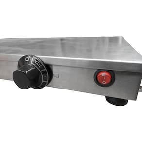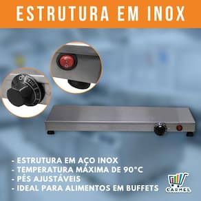 A mesa quente conserva os alimentos quentes para consumo, fabricado em aço inox, tem controle de temperatura, pés ajustáveis e pode usar cubas GN de 1/3 ou 1/1.