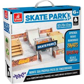 o skate park é um conjunto de skate de dedo que conta com: Uma rampa com escada e corrimão, caixote, obstáculos, rampa com gap e half. tudo isso para aprender, treinar e ser o campeão de manobras no Skate de Dedo!