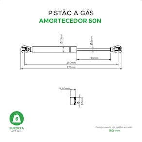 - Força Normal: 60N - Cor: Prata - Aplicações: Cadeiras, poltronas, portas de armários, capôs de carros, etc. - Material: Aço inoxidável - Dimensões: Variáveis conforme o modelo - Capacidade de Carga: Dependendo do projeto e da necessidade específica - Curso: Conforme especificações técnicas do modelo - Comprimento: 27cm Marca: Não Informado
