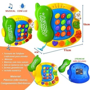 O Telefone Musical é ideal para crianças a partir de 1 ano e meio pois tem como propósito ensinar e divertir, fazendo com que as crianças desenvolvam o raciocínio lógico, habilidades visuais e auditivas. O Telefone ensina os sons dos números,sons do animais e músicas divertidas! Perfeito para o desenvolvimento.