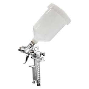 ESPECIFICAÇÕES TÉCNICAS Diâmetro do bico: 1,0 mm Entrada de ar: 1/4 Pressão de trabalho: 22 - 35 lbs Consumo de ar: 2 - 4 pcm Caneca: 600 ml - plástica Tipo de alimentação: Gravidade Sistema: Convencional Tecnologia: HVLP Unidade:1pç Código de Fabrica:13576