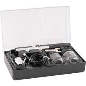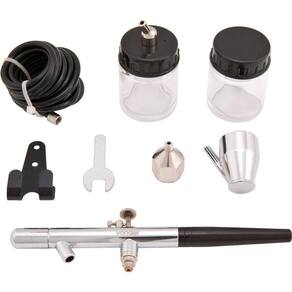 1 Aerógrafo, 1 suporte, 1 chave, adaptador 1/16" NPT (macho) x 1/4" NPT (fêmea), 1 copo de pintura, 1 mangueira de ar, 1 frasco para tinta (com tampa) e 1 frasco para tinta (com tampa e adaptador)