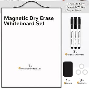 Conjunto de quadro branco Super Value: este pequeno conjunto de quadro magnético vem com um quadro apagável a seco de 16 x 12 polegadas para parede, 3 ímãs, 1 borracha, 3 marcadores pretos com tampas magnéticas de borracha seca. O kit de quadro branco suspenso inclui tudo o que você precisa para fazer anotações, corrigir fotos e limpar no mini quadro branco. Com esses acessórios, sua imaginação será totalmente liberada em quadros brancos.