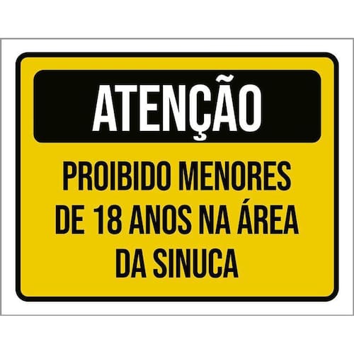 Placa Atenção Proibido Menores 18 Anos Sinuca 36x46 Informações do Produto: Placas decorativas fabricadas com poliestireno de alto impacto PSAI de 2mm e impressão ultravioleta. - Medidas: 36cm x 46cm - Fixação: Todas as placas possuem adesivo dupla face para aplicação em qualquer tipo de superfície lisa. de 12 meses e disponibilidade imediata. Marca: Não Informado Ean: 7794884024001