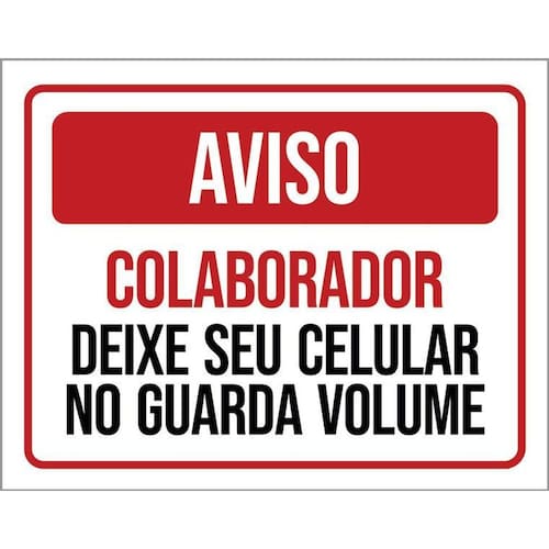 Placa Aviso Colaborador Deixe Celular Guarda Volume 36x46 - Informações do Produto: Placas decorativas fabricadas com poliestireno de alto impacto PSAI de 2mm e adesivo vinil automotivo de alta performance. - Medidas: 36cm x 46cm - Fixação: Todas as placas possuem adesivo dupla face para aplicação em qualquer tipo de superfície lisa. de 12 meses e disponibilidade imediata. Marca: Não Informado