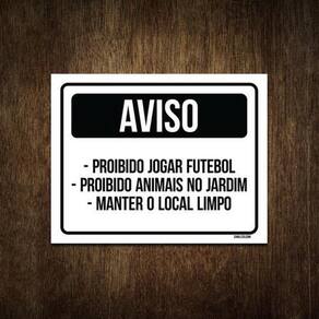 Placa aviso proibido futebol animais no jardim 36x46 Não precisa furar, não empena e nem perde a cor no sol, pode ser rebitada e não rasga - informações do produto: Placas decorativas fabricadas com poliestireno de alto impacto psai de 2mm e adesivo vinil automotivo de alta performance. - medidas: 36cm x 46cm - fixação: Todas as placas possuem adesivo dupla face para aplicação em qualquer tipo de superfície lisa. de 12 meses e disponibilidade imediata.