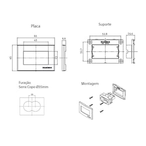 Dimensões AxLxP (mm): Placa: 45x65x6,6 - Suporte 32,7x52,8x14,4