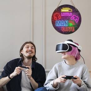 Design: Nossa decoração de letreiro de madeira em caverna para homenzinhos apresenta vários padrões de néon, como fones de ouvido e consoles de jogos, decora bem o ambiente.
