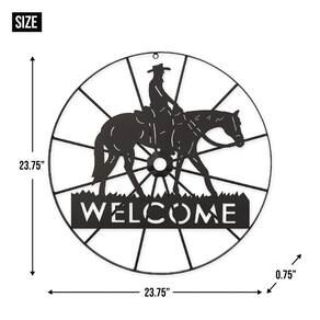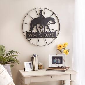 - Receba seus convidados em sua casa com esta placa de inspiração ocidental. Esta decoração de parede pronta para o rancho apresenta um design de roda de vagão, silhuetas de um cowboy em seu fiel corcel e a palavra “bem-vindo” na grama abaixo dos cascos do cavalo.