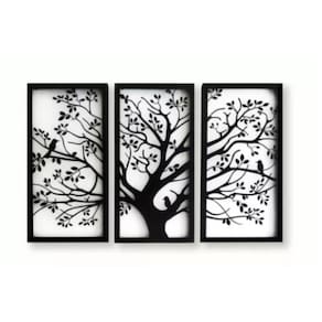 Descrição: BELAS imagens de artesanato para decoração de casa. Sua compra inclui: 3 molduras com figura de árvore\ n\ nMedidas: 39 cm x 23 cm\ nMaterial: madeira MDF 3 mmCor: preto\ nVem com fita dupla face para ser colocada diretamente na parede (recomenda-se que a superfície esteja limpa)\ n\ nEnvio rápido para todo o Chile