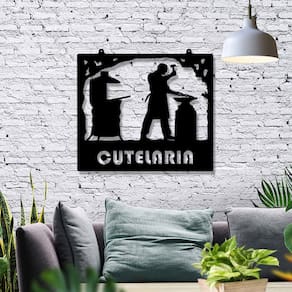 Especificações Técnicas: Medidas: comprimento: 30 cm altura: 3mm largura: 26 cm Material: mdf 3mm Cor: preto Tema: cutelaria Formas de instalação: basta utilizar fitas dupla face Quantidade: 1 unidade