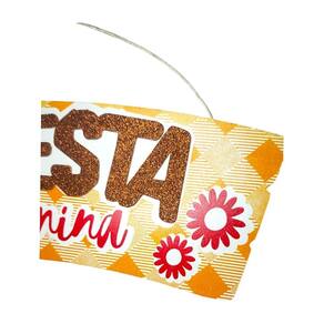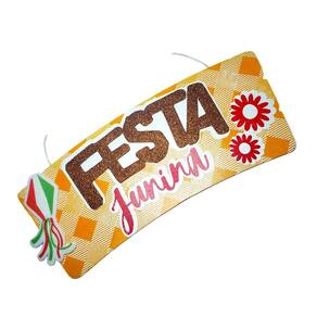 A imagem mostra um enfeite temático de Festa Junina, uma tradicional celebração brasileira. O enfeite tem um formato curvado e fundo com estampa de quadriculado amarelo e laranja, lembrando as típicas decorações de festa junina. No centro, há a palavra FESTA escrita em letras grandes e brilhantes com textura dourada, e logo abaixo Junina em uma fonte cursiva vermelha. À esquerda, há um desenho de um balão colorido em verde, branco e vermelho, com fitas penduradas. À direita, há duas flores estilizadas em vermelho com miolo branco, reforçando o estilo festivo e alegre do item. O enfeite tem uma alça na parte superior, sugerindo que pode ser pendurado para decorar ambientes. Altura: 12 Largura: 26 Marca: Não Informado Ean: 7899989337602