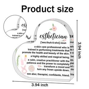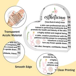 Esta decoração de acrílico de coração apresenta um belo design e mensagem significativa. É perfeita para adicionar interesse a qualquer espaço e adicionar um toque de personalidade ao seu ambiente diário. Além disso, é um presente impressionante para dar a ele para mostrar o quanto você se importa. - O pacote inclui: O pacote contém 1 peça de presente esteticista, você pode dar a ele/ela como um presente bonito e significativo, ou você pode colocá-lo em sua mesa como decoração - Tamanho perfeito: este tamanho de placa acrílica em forma de coração é de cerca de 10 x 10 x 1,5 cm. - Material: O material acrílico cristalino é agradável aos olhos, estrutura sólida e não quebra facilmente, impressão clara e não desbota, superfície lisa e sensação de toque confortável, pode manter-se em boas condições por um longo tempo - Presente de agradecimento: Palavras de agradecimento femininas inspiradoras combinadas com acrílico de amor brilhante, este presente é o melhor desejo para o seu parceiro. É um momento tão agradável quando ela a recebe em uma festa de aniversário, Natal, Ação de Graças. - Amplamente aplicável: a decoração positiva motivacional clara pode ser aplicada para decorar várias ocasiões, como colocá-la em sua sala de estar, mesa de cabeceira, escritório, lareira, mesa, estante e muito mais, trazendo a você um clima agradável