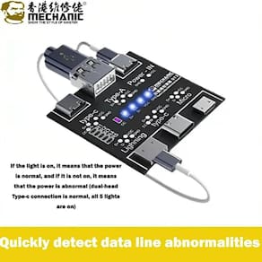 Placa para teste de cabos de dados e carregamento de celular, compatível com múltiplos padrões USB (Type-A, Type-C, Lightning, Micro USB). Permite diagnóstico rápido de conexões D+, D-, VCC e outros sinais. Design compacto e material robusto para durabilidade.Vendido e entregue por Olist Store