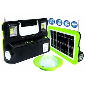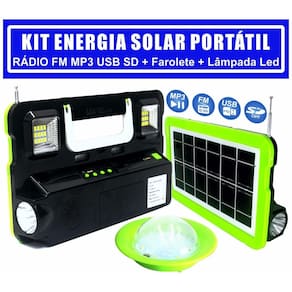 Nesse kit você encontra várias funções, como por exemplo, rádio fm, entrada para pen drive usb e cartão sd, alem disso você pode usá-lo como lanterna, luz de emergência e ainda tem 1 lâmpada pendente.