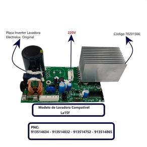 Placa Inversora Lavadora Electrolux La15f 220V 70201566 A Placa de Potência para Máquina de Lavar controla o ciclo de lavagem, parada e acionamento das demais funções garantindo a melhor performance. A Eletro Peças Amorim recomenda a contratação de um serviço de assistência técnica capacitada para realizar a troca de peças de reposição. Não nos responsabilizamos pela montagem/instalação dos produtos. Verifique com o fabricante do produto e de seus componentes eventuais limitações à utilização de todos os recursos e funcionalidades. Todas as informações divulgadas, bem como os benefícios e resultados do produto são de responsabilidade exclusiva do Fabricante/Fornecedor. Imagens meramente ilustrativas. ESPECIFICAÇÕES TÉCNICAS Marca: Eletrolux Tipo do Produto: Placa de Potência Inverter Modelo: 70201566 Lavadoras Compatíveis: La15f PNC: 913514634 - 913514832 - 913514752 - 913514865 Pedimos que antes de comprar, confirme o código da peça antes de concluir sua compra, para evitar possíveis erros de compra. Estamos sempre a disposição para qualquer de duvidas. Fale conosco pela aba Perguntas. Cuidados na Instalação da sua placa para sua Lavadora Todas as placas da Placas Eletrônicas são testadas antes de saírem da empresa para a trasnportadora. Antes de trocar a placa, verifique se o defeito foi causado por algum componente da máquina ou algum agente externo para não danificar a placa nova. Para maiores informações consulte seu técnico ou fale conosco na campo Perguntas. Abaixo Algumas Causas de Defeitos na Placa: Antes de aplicar a Placa, Verificar Dispositivo Trava da Porta, Pressostato, Válvulas, Bomba de Drenagem, Capacitor, Motor, Timer, e Fiação Que Podem Estar em Curto Danificando a sua Placa. na rede elétrica; Vazamento de água sobre a placa; Excesso de sabão; Curto circuito no chicote ou componentes da máquina; Chicote de fios interrompido; Ação de roedores e insetos; Local com umidade do ar excessiva ou maresia causando corrosão; Carga de roupa acima da capacidade da máquina; Dúvidas Frequentes Como sei se o peça é compatível com minha lavadora ou refrigerador R: Geralmente o modelo fica localizado na etiqueta colada atrás da lavadora ou refrigerador, depois é só confirmar se o modelo confere com a descrição do anúncio. O que significa quando a voltagem da peça é bivolt R: Quando estiver na descrição que o produto é bivolt, significa que ele é compatível tanto com aparelhos 110 volts ou 220 volts. No Título tem o modelo. Mas como eu sei qual seria a versão R: Tem modelos de lavadoras e refrigeradores que possuem versões de peças que chamamos de PNC Electrolux, ou Versão da Engenharia Brastemp e Consul, ou placas diferentes, isso significa que além do modelo você terá que confirmar o código da etiqueta colada na própria peça e ver se confere com a descrição do anúncio. Marca: Não Informado