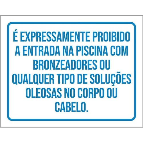 Placa Não Entra Piscina Bronzeador Soluções Oleosas 36x46 - Informações do Produto: Placas decorativas fabricadas com poliestireno de alto impacto PSAI de 2mm e adesivo vinil automotivo de alta performance. - Medidas: 36cm x 46cm - Fixação: Todas as placas possuem adesivo dupla face para aplicação em qualquer tipo de superfície lisa. de 12 meses e disponibilidade imediata. Marca: Não Informado