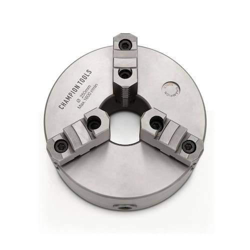 Placa para Torno com 3 Castanhas Sobrepostas Reversíveis 250mm ChampionTools 900.036 A Placa para Torno com 3 Castanhas Reversiveis Diâmetro 250mm TECNO 900.036 é utilizada para fixação de peças no torno durante a usinagem. Possui excelente exatidão, garantido baixos níveis de excentricidade e batimento radial. Garantia direto pelo fabricante.