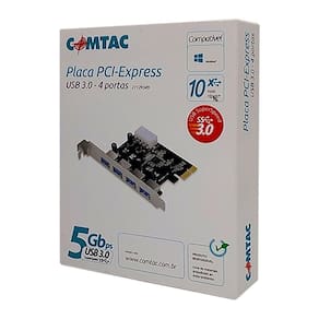 Placa Pci-e Controladora Comtac, 4 Portas Usb 3.0 - 27129349-r.03 b>MARCA: COMTACMODELO: 27129349-R.03 Desenvolvida para solucionar a falta de conexões USB 3.0 do seu desktop, a Placa PCI-Express USB 3.0 SuperSpeed Comtac acrescenta 4 portas USB 3.0 diretamente no computador. A instalação é simples e rápida, basta conectar a placa no slot PCI-Express na placa-mãe e desfrutar dessa tecnologia que atinge velocidade até dez vezes superior ao padrão USB 2.0. ESPECIFICAÇÕES: ; Interface PCI-Express:Conector: PCI-Express X1 (Revisão 2.0)Taxa de Transferência:Até 5 Gbps (PCIe 2.0)Até 2.5 Gbps (PCIe 1.0a)Indicador de Atividade: LED de statusAlimentação: Conector interno de 4 pinos para fornecimento extra de energiaInterface USB 3.0:Portas: 4 portas USB 3.0 SuperSpeedTaxa de Transferência USB 3.0: Até 5 GbpsCompatibilidade USB 2.0: Até 480 Mbps (High Speed) Sistemas Operacionais Compatíveis:Windows (32-64 bits): 10, 8.1, 8, 7, Vista, XP Observações:Taxas de Transferência: As taxas indicadas são máximas teóricas; a taxa real depende de dispositivos conectados e qualidade dos cabos.Alimentação: Para fornecer energia para todas as portas USB, conecte o cabo de alimentação (4 pinos molex) da fonte do computador à placa.