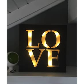 Placa Quadro Decorativo Love Iluminado a Led a Pilha 34 x 34cm Combine bom gosto em qualquer ambiente da sua casa com o quadro Love com Iluminação em Led. Esse artigo decorativo será a sintonia perfeita de harmonia, sofisticação e beleza que faltava em seu ambiente. Dê um toque mais que especial na decoração. Especificação: - Tamanho AxLxP: 34 x 34 x 3cm, - Fonte de energia: 3 pilhas AA (não inclusas), - Cor: Preto, - Composição: Madeira, Metal e Componentes Eletrônicos, - Peso: 690g. - Imagens Ilustrativas