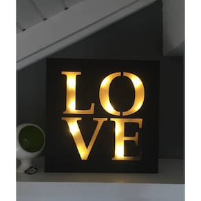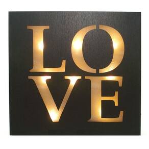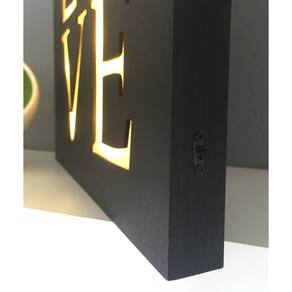 Placa Quadro Decorativo Love Iluminado a Led a Pilha 34 x 34cm Combine bom gosto em qualquer ambiente da sua casa com o quadro Love com Iluminação em Led. Esse artigo decorativo será a sintonia perfeita de harmonia, sofisticação e beleza que faltava em seu ambiente. Dê um toque mais que especial na decoração. Especificação: - Tamanho AxLxP: 34 x 34 x 3cm, - Fonte de energia: 3 pilhas AA não inclusas , - Cor: Preto, - Composição: Madeira, Metal e Componentes Eletrônicos, - Peso: 690g. - Imagens Ilustrativas Ean: 7899432852560
