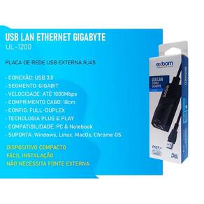 Marca: Exbom Modelo: UL-1200 Condição: Novo Conexão: USB 3.0 Conector: RJ45 Suporte: Gigabit Comprimento Cabo: 18cm Velocidade: 10/100/1000Mbps Compatibilidade: USB 1.0 / 2.0 / 3.0 Altura: 3cm Largura: 3cm Peso: 34g Comprimento: 9,5cm + 18cm Cabo Suporta Full-Duplex e Half-Duplex Ethernet Sistemas compatíveis: Windows, MacOs, Chrome Os Dispositivos compatíveis: Computador, Notebook, Netbook, MacAir Dispositivo compacto, pode ser levado para qualquer lugar Instalação Rápida e Fácil com Plug and Play