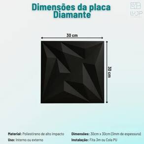 Placa Revestimento Parede Diamante 3d 25un 30x30cm + Fita 3m Modelos: Preto Quantidade: 25 Placas Material: Poliestireno Alto Impacto Modelo: Diamante Cor: Branco ou preto com acabamento fosco e corte a laser. Espessura: 0.3mm Tamanho: 30cm x 30cm Nossas placas de poliestireno são exclusivas com corte a laser, oferecendo um acabamento fosco único no mercado, totalmente diferente do que você já viu. Fáceis de instalar, resistentes e adaptáveis, nossas placas transformam seus espaços com praticidade e estilo Instalação fácil, sem necessidade de profissional. Material resistente, com relevo que não amassa nem afunda. Instalação limpa, sem quebra-quebra. Ideal para paredes com umidade, mofo, textura, madeira e azulejo. Perfeito para ambientes internos e externos. Lavável para manter sempre como novo. de durabilidade por 10 anos. Dispensa pintura, economizando tempo e dinheiro. Fácil instalação com fita 3M, cola de contato ou cola PU. Cortes precisos feitos a laser para um resultado impecável. Transforme seu espaço com praticidade e estilo Área externa: Instalação com cola de contato e pintura obrigatória com tinta a base de água Área interna: instalação com fita dupla face, cola pu ou cola de contato e pintura opcional. A cor das placas nas fotos é igual à cor real do produto Resposta: As placas são na cor branca ou preta. Porém você pode aplicar tinta a base de água na cor de sua preferência, após a instalação. Posso colar as placas na parede com textura Resposta: Sim, você pode colar as placas em paredes com textura, desde que não seja chapiscado, mas é importante usar um adesivo de montagem adequado para garantir uma fixação segura. Qual é o peso de cada placa As placas acompanham fita dupla face Resposta: Sim, esse anuncio já acompanha a fita dupla face 3m para facilitar sua instalação As placas se encaixam conforme o vídeo Resposta: Sim, nossas placas são projetadas para se encaixar de forma fácil e eficiente, conforme mostrado no vídeo demonstrativo. Preciso de uma quantidade maior do que a disponível no anúncio. Posso encomendar mais Resposta: Sim, se precisar de uma quantidade maior do que a disponível, basta solicitar e nós calculamos a quantidade de acordo com as medidas fornecidas e indicamos outro anúncio correspondente para efetuar a compra. Posso usar as placas 3D em áreas externas descobertas Resposta: Sim, nossas placas são adequadas para uso em áreas externas descobertas, desde que instaladas corretamente e de acordo com as orientações do fabricante. Elas são resistentes a condições climáticas, mas recomendamos consultar as especificações de cada modelo para garantir a durabilidade ideal. do vendedor: 30 dias