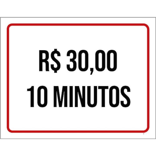 Placa Sinalização - 30 Reais 10 Minutos 36x46 - Informações do Produto: Placas decorativas fabricadas com poliestireno de alto impacto PSAI de 2mm e adesivo vinil automotivo de alta performance. - Medidas: 36cm x 46cm - Fixação: Todas as placas possuem adesivo dupla face para aplicação em qualquer tipo de superfície lisa. de 12 meses e disponibilidade imediata. Marca: Não Informado Ean: 7794724285135