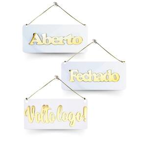 As placas acrílicas de aberto, fechado e de volto logo foram projetadas para serem utilizadas em lojas, studios e salões de beleza, e todo tipo de estabelecimento, são um tipo de sinalização projetadas para serem exibidas na entrada do estabelecimento comercial sinalizando o status atual do local. Criadas com o propósito de direcionar a atenção dos clientes para promover a marca, oferecer informações relevantes e fornecer instruções específicas como a que essas especificamente transmitem avisando o cliente que a loja está aberta para recebe-lo, está fechada e fora de atendimento, ou que o atendimento não pode ser realizado naquele momento.