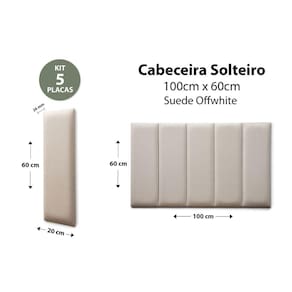 Placas Cabeceira Modulada Adesiva Solteiro Estofada 100cm x 60cm Kit 5 Placas - Suede Off WhiteAs cabeceiras estofadas para cama box Flamingo Design trazem conforto e sofisticação para o seu quarto, tornando o ambiente mais aconchegante! As placas moduladas são uma ótima opção de decoração para você que quer praticidade na hora da instalação. Não é necessário furar a parede, as placas possuem fitas adesivas para fixação e você mesmo pode instalar facilmente!Nossos móveis são fabricados com materiais de alta qualidade e durabilidade, de fácil instalação e limpeza.A Flamingo Design te dá uma garantia de 3 meses contra qualquer defeito de fabricação!Confira abaixo mais detalhes sobre o produto:- Marca: Flamingo Design.- Modelo: Placa Modulada Adesiva.- Tamanho: Solteiro.- Qtd Peças: 5.- Comprimento Total: 100cm.- Altura: 60cm.- Largura (espessura): 26mm.- Material: MDF e espuma.- Fixação: Na parede com fita adesiva que já acompanha o produto.- Garantia: 3 meses.- Tecido: Suede.- Cor: Off White.Quantas placas você precisa para montar sua cabeceira?- Solteiro: 5 placas (100cm de largura).- Casal: 7 placas (140cm de largura).- Queen: 8 placas (160cm de largura).- King: 10 placas (200cm de largura).Como é feita a instalação?- Aplicar sobre a parede limpa (utilize um pano seco para remover qualquer poeira).- Faça as marcações na parede para auxiliar na instalação usando um nível ou fita métrica.- Observe as tramas do tecido para que todas as placas fiquem na mesma direção (veja a marcação atrás da cabeceira indicando o sentido).- Retire a proteção das fitas adesivas da placa.- Cole diretamente na parede uma placa de cada vez, pressionando por alguns segundos para garantir a colagem.Cuidados adicionais:- Instale as placas somente em paredes lisas. Não garantimos uma boa fixação em paredes com textura ou grafiato.- Pode ser colado em parede lisa, MDF, drywall, papel de parede liso (sem textura).- Para remover as placas utilize uma espátula e puxe com cuidado para descolar o adesivo (se desejar utilize um secador de cabelo para amolecer o adesivo).- As fotos são reais do produto. Podem ocorrer pequenas diferenças de cor devido ao tratamento de imagem e calibragem de cores do seu monitor ou celular. Marca: Flamingo Design