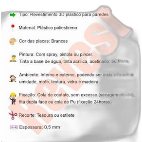 Com um total de 16 placas, cada uma medindo 50x50cm, essas placas são feitas de poliestireno PSAI plástico, garantindo resistência e durabilidade. Além disso, todas as placas são da cor branca, o que permite combinar com diferentes estilos de decoração.
