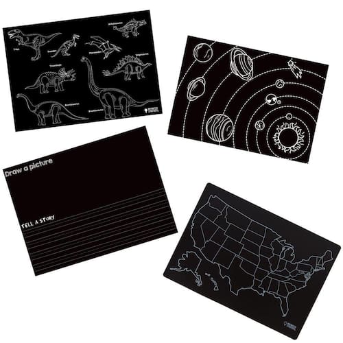 Este conjunto inclui 4 tapetes para colorir diferentes, de dupla face, reutilizáveis, sem poeira, nos seguintes designs: Dinossauros, Sistema Solar, Desenhe uma Imagem/Conte uma História, Mapa dos EUA. FACILITE A ESPERA PELO JANTAR OU DEIXE OS CONVIDADOS RABISCAREM PARA SE DIVERTIR. De qualquer forma, esses inteligentes jogos americanos reutilizáveis de quadro-negro tornam cada refeição mais divertida e criativa! DEIXE SEUS FILHOS SENTIREM A ALEGRIA DE USAR A IMAGINAÇÃO! Termine o tempo de tela do dispositivo na mesa com os jogos americanos de tabuleiro temáticos Imagination Starters e deixe que eles pratiquem seus estados e planetas, pinterem um dinossauro ou desenhem e escrevam uma história. Quando terminar, vire para o lado em branco para deixá-los desenhar sua própria figura. Quer exibam uma obra-prima de arte, rabisquem ou escrevam, usarão sua imaginação e exercitarão sua criatividade. LAVÁVEL E REUTILIZÁVEL PARA SER REPETIDAMENTE! Esses jogos americanos de quadro-negro são totalmente laváveis para serem s repetidamente por seus filhos e por toda a família. Fácil de limpar com um lenço. DESENHE, PINTE, RABISQUE! Funciona com giz, marcadores de giz ou lápis de cor de giz Imagination Starters (vendidos separadamente) e apaga facilmente com água!