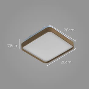 **ESPECIFICAÇÕES TÉCNICAS:** - Modelo: Plafon Timber 12W - Cor da Luz: Banco Quente 3000k - Material: Metal e Acrílico - Voltagem: Bivolt 110/220v - Potência: 12W ou 720 lúmens - IP20 - Frequência: 60 Hz - Fator de Potência: >0,5 - Corrente Elétrica: 0,3A - Vida Útil: ~25.000 horas - Ângulo de Abertura: 120° - Largura: 28cm - Comprimento: 28cm - Altura: 7cm - Peso: ~ 0,6 kg - IRC > 80 - Peso Bruto: 850g - Peso Líquido: ~ 650g - Caixa: 32,5 x 32,5 x 11cm - Garantia: 12 meses - Não dimerizável