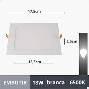 Benefícios do Produto Iluminação homogênea – evita sombras e garante um ambiente bem iluminado Baixo consumo de energia – tecnologia LED com alta eficiência energética Design moderno e discreto – embutido no teto, combina com qualquer decoração Material resistente e durável – estrutura em alumínio para maior dissipação de calor Fácil instalação – modelo embutir, ideal para tetos de gesso, forro ou drywall Bivolt automático – compatível com redes elétricas de 100V a 240V Especificações Técnicas Modelo: Embutir Quadrado Potência: 12W Temperatura de Cor: 6500K (Branco Frio) Tensão: Bivolt (100V a 240V) Eficiência Energética: LED de alta durabilidade Grau de Proteção: IP20 (uso interno) Material: Policarbonato Instalação: Embutir Ambientes Indicados Ideal para iluminação de diferentes espaços: