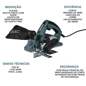 Dados técnicos Ajuste de profundidade de corte fino Controle frontal de profundidade de corte Saída de pó para à direita ou para à esquerda Interruptor com trava de segurança Base de alumínio. Potência: 900w; Rotação: 16000/min; Profundidade máxima de corte: 3mm; Lagura máxima de corte: 82mm; Profundidade máxima de entelhamento: 16mm; Peso da máquina: 2,8kg Acessórios -01 chave; -01 coletor para pó; -01 guia para cortes paralelos; -01 guia para rebaixo; -02 facas de metal duro instaladas na plaina ; -01 par de luvas; -01 óculos de segurança.