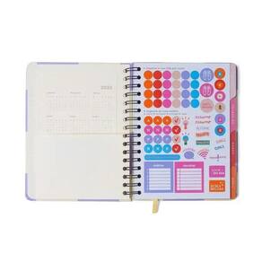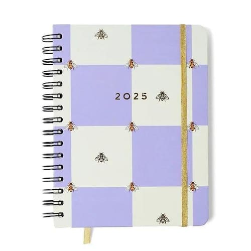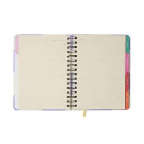 A Agenda Planner Wire-o 2025 Melissa Semanal Notas com Divisórias A5 Casa das Abelhas Lilás tem a dupla semanal agora conta com um design mais limpo e funcional, com os tópicos localizados na base da página: Área destacada para importante, pautas para os objetivos e lista de checagem.