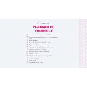 Desenvolvido e calculado a partir de muitas pesquisas, nasceu o Planner CI PIY - Planner It Yourself. O Planner mais completo que você já viu, perfeito para o dia a dia de quem precisa de praticidade, mas não abre mão de suas anotações no papel. Dividido em 2 grandes categorias para facilitar sua organização, ele possui planejamento mensal e semanal, além de página de metas e finanças.