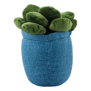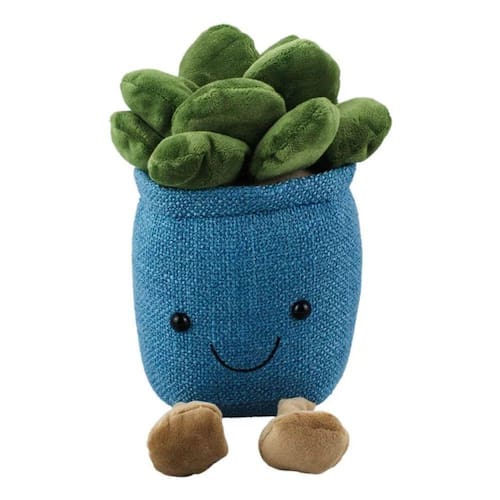 Pelúcia no formato de uma planta de vaso azul com rosto feliz e duas perninhas. Plantinha de pelúcia tem 20 cm de altura medido sentado. As pernas são soltas, podendo ficar estendidas. Quando colocado na superfície fica sentado. Material: poliéster; Enchimento: fibra de poliéster; Produto certificado por Órgão acreditado pela CGCRE do INMETRO