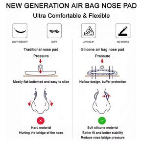 Essa plaqueta possui uma câmara de ar no interior, o que ajuda a distribuir o peso dos óculos de forma mais uniforme, reduzindo a pressão sobre o nariz. Além disso, ela vem em um formato de gotas, que se encaixa perfeitamente na estrutura dos óculos.