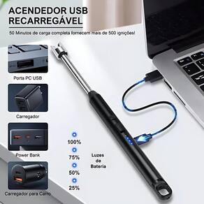 Plasma Power Pro: Acendedor Recarregável para Cozinha O isqueiro elétrico além de ser lindo e muito prático é recarregado pela conexão USB do computador, pelo carregador de celular, pela tomada, qualquer aparelho que tenha USB. Perfeito para ser em qualquer ambiente sem se preocupar com chuva ou vento. Nenhum gás ou combustível é necessário. Este isqueiro é adequado para acender , fogueiras, churrasqueiras, fogões de acampamento, lareiras, fornos e quaisquer outros usos óbvios. Não tem chama, por isso não é afetado pelo vento ou pela água. Você pode usá-lo sob quaisquer condições; faça chuva ou faça sol, perfeito para churrasco ao ar livre e viagem de acampamento. É recarregável contem um cabo para carregamento USB. O recurso de desligamento automático de 10 segundos garante um uso seguro que evita danos por temperatura muito alta. O pescoço longo e flexível pode ser girado em 360 graus e dobrado em diferentes direções para atender a diferentes aplicações. O design leve e compacto torna o isqueiro fácil de ser carregado e ideal para acampamentos, viagens, churrasco e atividades internas ou externas. Características adicionais: - Recarregável - Luzes indicadoras de bateria 4 Níveis - Flexível com Rotação em 360 - Isqueiro em Aço Inoxidável - Isqueiro a prova de vento pois não produz chamas - Não possui chamas é operado eletricamente Recomendado para uso em: - Acender velas - Fogão a Gás - Carvão Importante: - Recomendado deixar longe do alcance de Crianças Dimensões aproximadas: - Comprimento: 26 cm - Peso: 50g Material: - Aço inoxidável - Plástico ABS Itens incluso: - 1 Isqueiro Acendedor Eletrônico e Arco Flexível com USB - 1 Cabo de Carregamento Marca: Não Informado Ean: 7895688643211