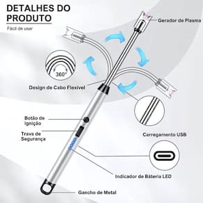 Plasma Tech Recarregável - Acendedor USB para Cozinha O isqueiro elétrico além de ser lindo e muito prático é recarregado pela conexão USB do computador, pelo carregador de celular, pela tomada, qualquer aparelho que tenha USB. Perfeito para ser em qualquer ambiente sem se preocupar com chuva ou vento. Nenhum gás ou combustível é necessário. Este isqueiro é adequado para acender , fogueiras, churrasqueiras, fogões de acampamento, lareiras, fornos e quaisquer outros usos óbvios. Não tem chama, por isso não é afetado pelo vento ou pela água. Você pode usá-lo sob quaisquer condições; faça chuva ou faça sol, perfeito para churrasco ao ar livre e viagem de acampamento. É recarregável contem um cabo para carregamento USB. O recurso de desligamento automático de 10 segundos garante um uso seguro que evita danos por temperatura muito alta. O pescoço longo e flexível pode ser girado em 360 graus e dobrado em diferentes direções para atender a diferentes aplicações. O design leve e compacto torna o isqueiro fácil de ser carregado e ideal para acampamentos, viagens, churrasco e atividades internas ou externas. Características adicionais: - Recarregável - Luzes indicadoras de bateria 4 Níveis - Flexível com Rotação em 360 - Isqueiro em Aço Inoxidável - Isqueiro a prova de vento pois não produz chamas - Não possui chamas é operado eletricamente Recomendado para uso em: - Acender velas - Fogão a Gás - Carvão Importante: - Recomendado deixar longe do alcance de Crianças Dimensões aproximadas: - Comprimento: 26 cm - Peso: 50g Material: - Aço inoxidável - Plástico ABS Itens incluso: - 1 Isqueiro Acendedor Eletrônico e Arco Flexível com USB - 1 Cabo de Carregamento