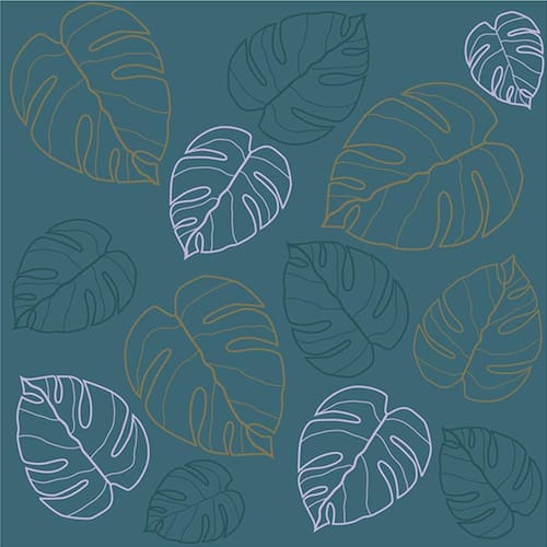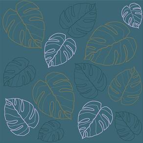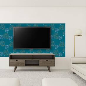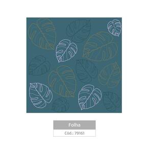 Utilizado para forrações de paredes, caixas e objetos, possui estampa de folhas com detalhes em dourado e fundo turquesa escuro.