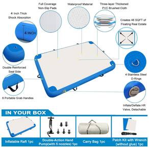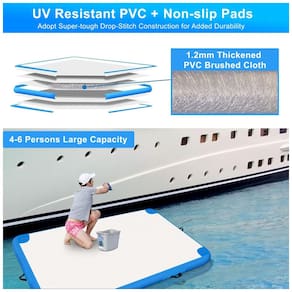 GRANDE PLATAFORMA INFLÁVEL A doca inflável serve como um resort flutuante. Acomoda confortavelmente 4 a 6 pessoas e mais de 600 kg de peso. Você pode adicionar coolers, cadeiras e guarda sóis para nadar, mergulhar, ioga, relaxar no lago ou bronzear. Os anéis em D de aço inoxidável são projetados para amarração rápida e fácil a qualquer doca, barco ou âncora. DURÁVEL, ANTIDESLIZANTE, A plataforma de doca inflável é feita de material costurado por gotejamento super resistente, PVC resistente a UV e almofadas antiderrapantes de EVA. Durável o suficiente para apoiar crianças e adultos a brincar sem se preocupar em cair na água. CONJUNTO COMPLETO Vem com plataforma de natação de doca inflável, uma bomba de mão, bolsa de transporte branca, 1 kit de remendo incluindo chave de porta de inflação, 4 argolas em D de âncora de aço inoxidável, 6 alças reforçadas de neoprene macio e 1 alta pressão inflar, desinflar a válvula HR. RAPIDAMENTE INFLAM E DESFLAÇAM Fornecemos uma bomba manual e válvulas de alta pressão para inflar e desinflar rapidamente a doca para você, trazendo conveniência de uso e economizando seu tempo. Além disso, a doca flutuante inflável também fornece uma bolsa de zenamento que é fácil de guardar e transportar. Embale o facilmente no porta malas do seu carro para um dia incrível no lago ou descendo o rio Marca: Não Informado
