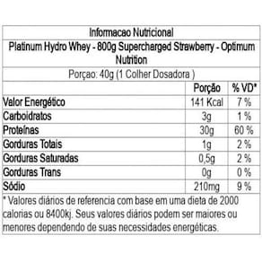 A OPTIMUM NUTRITION é uma das maiores marcas de suplementação do mundo, dona de diversos sucessos de venda que já ganharam prêmios de suplemento do ano a OPTIMUM NUTRITION investe pesado em tecnologia de ponta para a formulação de novos suplementos, hoje trouxemos um poderoso suplemento super proteico que é um sucesso de vendas e já foi considerado o melhor suplemento de sua categoria, estamos falando do poderoso HYDRO WHEY, o suplemento feito com proteína hidrolisada do soro do leite. O Platinum HYDRO WHEY é formulado apenas com o que há de mais puro e avançado quando falamos em tecnologia de purificação e concentração proteica, a OPTIMUM NUTRITION é considerada uma das maiores marcas do mundo por conta do seu investimento em tecnologia e os usuários de seus suplementos não poderiam esperar menos do Platinum HYDRO WHEY, por conta de sua tecnologia seu processo de absorção pelo organismo é feito de maneira rápida O processo de hidrólise consiste em ''quebrar as proteínas maiores em pedaços menores para que nosso corpo não tenha dificuldades ou leve muito tempo para absorver Benefícios: Aumento da massa magra; Maior reconstrução muscular; Aumento da força física; Previne o catabolismo muscular; Potencializa a síntese proteica; Rápida absorção pelo organismo; Contém grande quantidade de BCAAS Contém enzimas digestivas que melhoram ainda mais a absorção; Peptídeos que também melhoram a absorção pelo organismo; Sucesso de vendas;