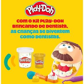 O KIT COMPLETO PARA DENTISTAS. O conjunto inclui 6 potes de massa de modelar Play-Doh (56 g), sendo 2 com efeito metálico, além de 10 ferramentas como escova que espreme pasta, espelho, pinça e fio dental para uma brincadeira imersiva.