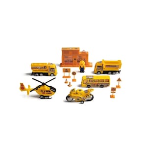 Itens Inclusos: 2 CAMINHÕES, 1 ÔNIBUS, 1 MOTO, 4 PLACAS DE SINALIZAÇÃO, 2 CONES, 1 BONECO, 1 CENTRO DE COMANDO, 1 HELICÓPTERO
