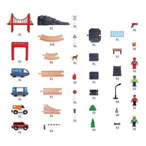Ficha Técnica Marca: Tooky Toy Modelo: Conjunto Pista de Trem Grande Material: Madeira e peças plásticas Itens inclusos: 70 peças (trilhos, trem, ponte, estação, bonecos, placas e acessórios) Idade recomendada: A partir de 3 anos